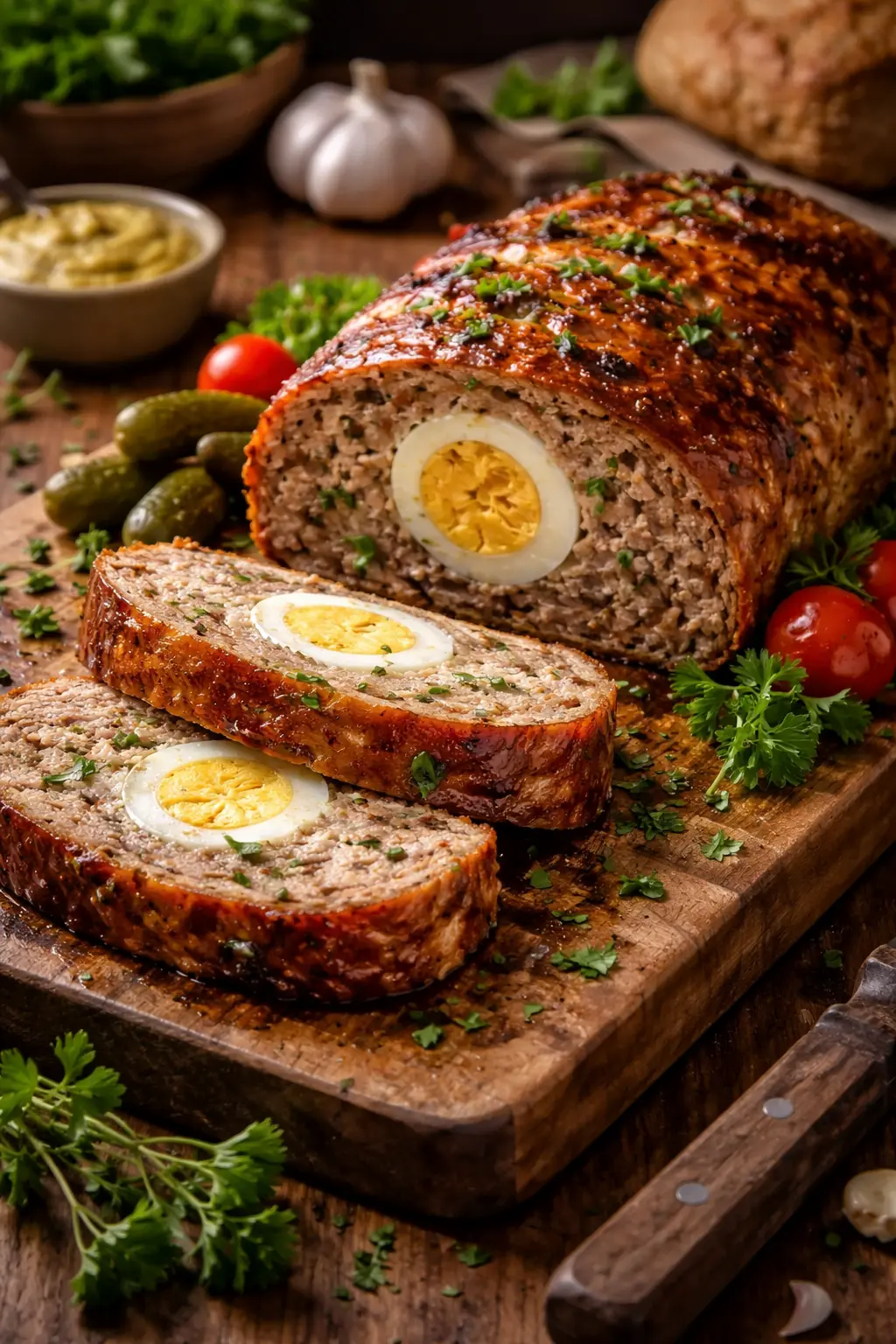 Die Hackfleischmasse auf einer befeuchteten Arbeitsfläche zu einem länglichen Laib (ca. 20–22 cm lang) formen. Für die klassische Variante: Einen Streifen Hackfleisch flach drücken, die gekochten Eier in einer Reihe darauflegen und dann rundherum verschließen. Optional: Den fertigen Laib mit Speckscheiben umwickeln – das gibt extra Aroma und Saftigkeit.